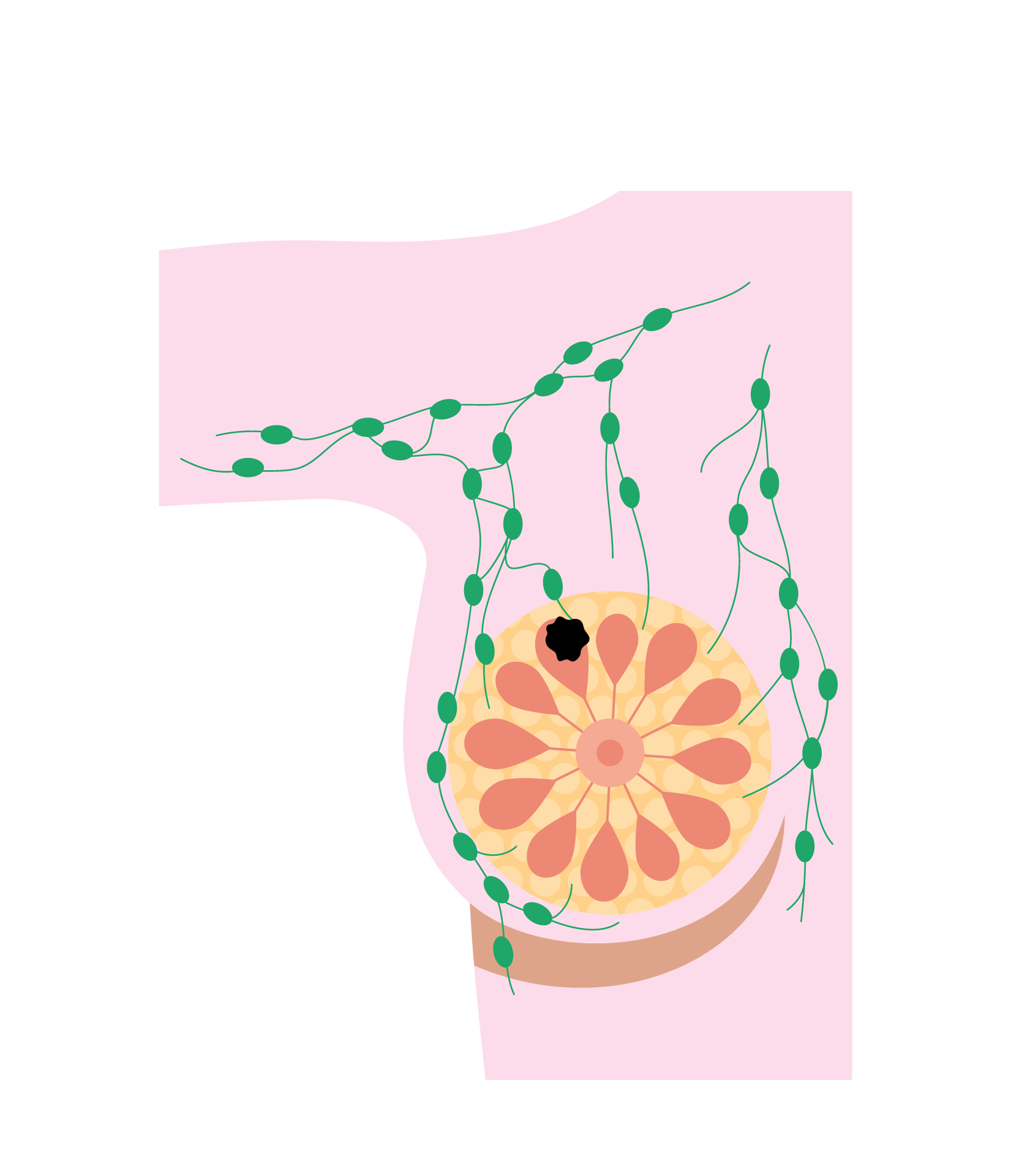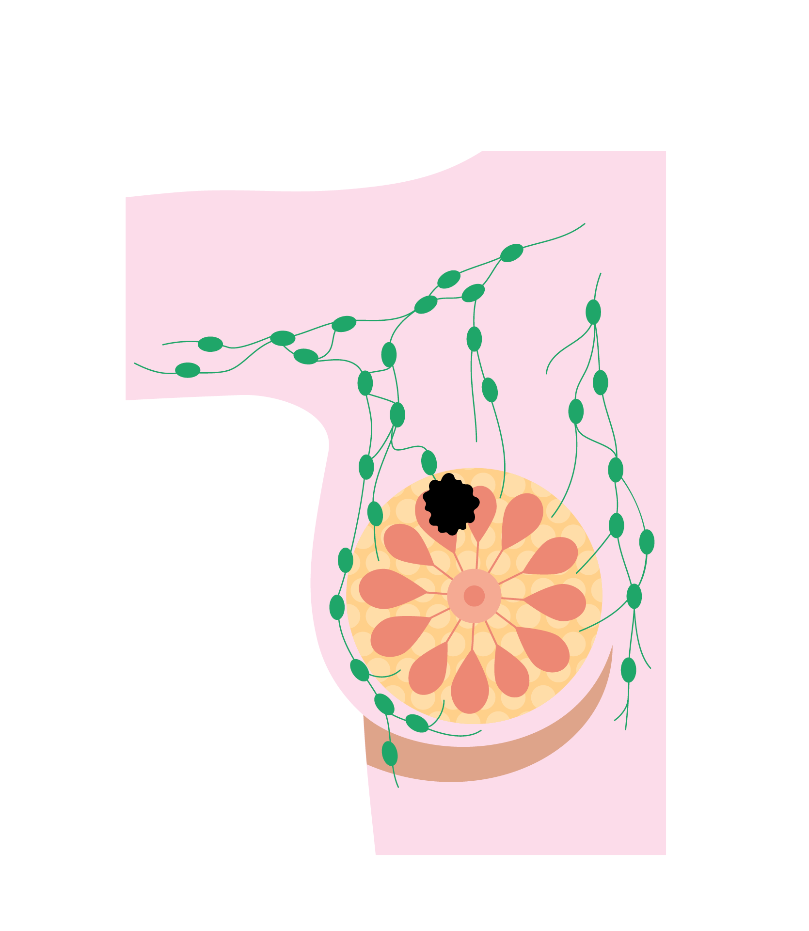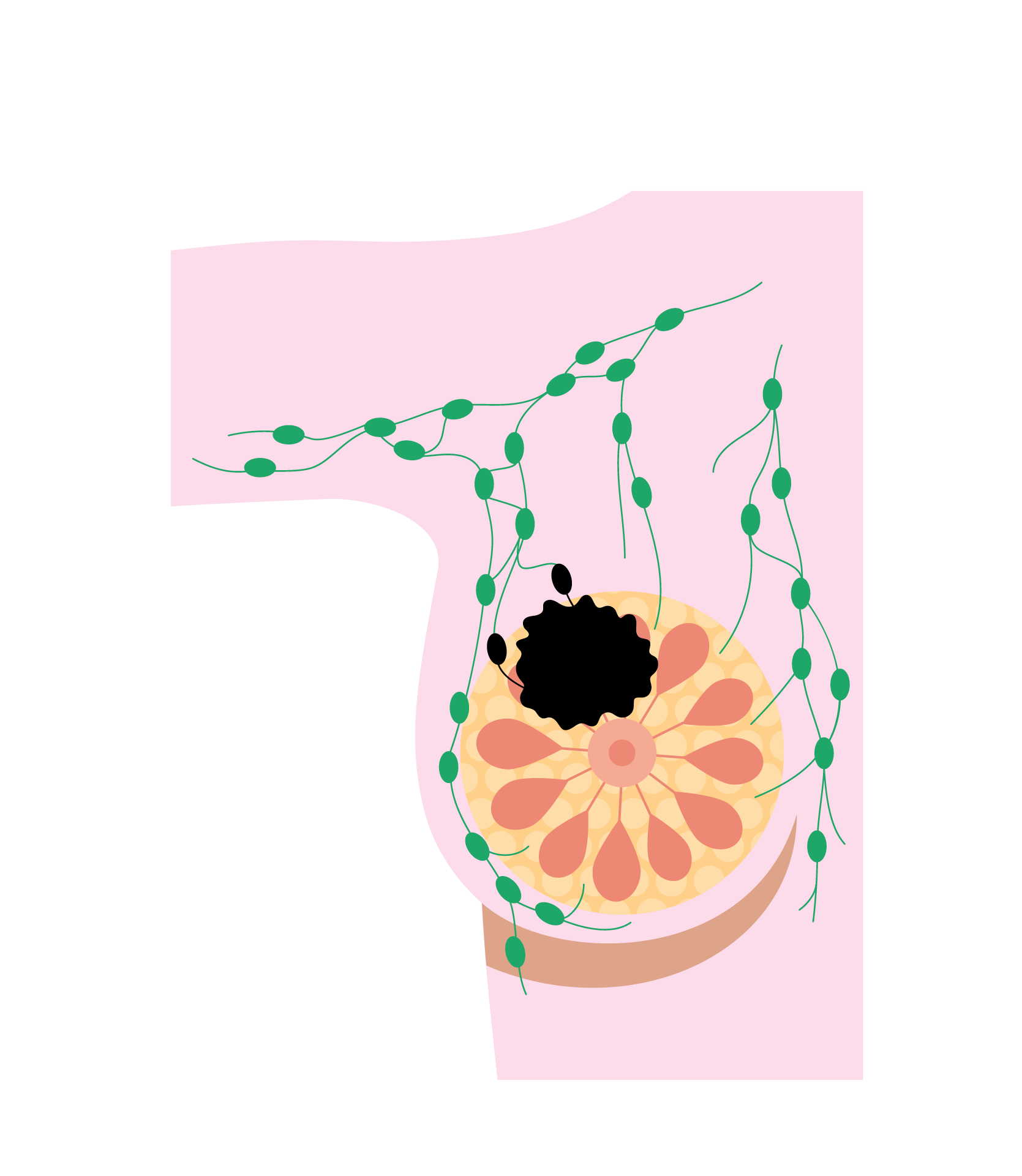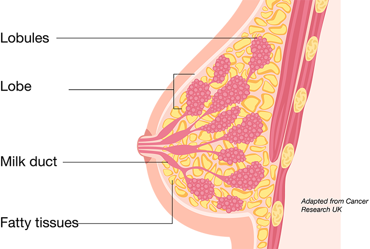 - Glandular tissue divided into lobes (each containing lots of lobules)
